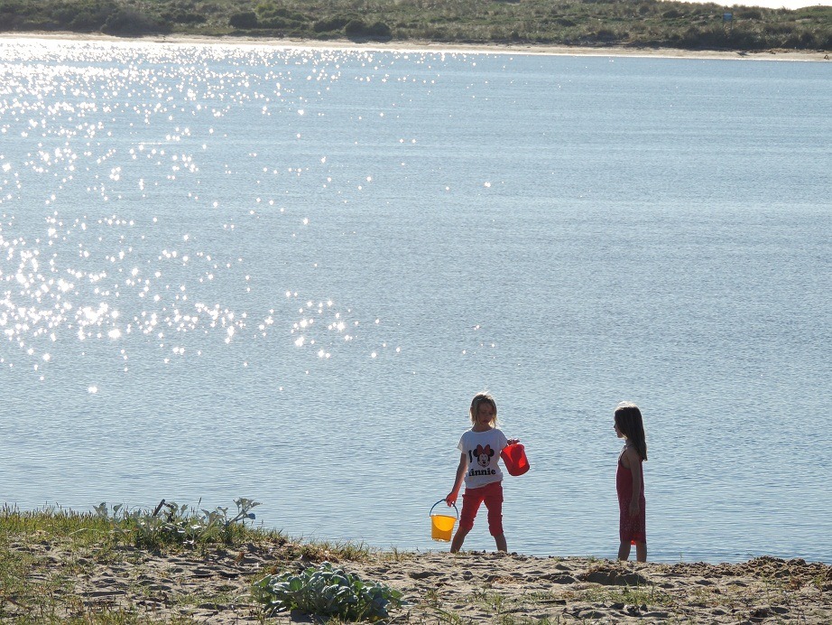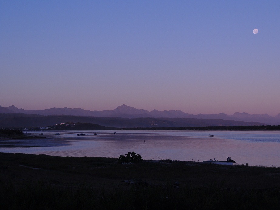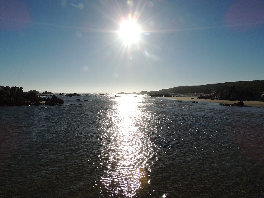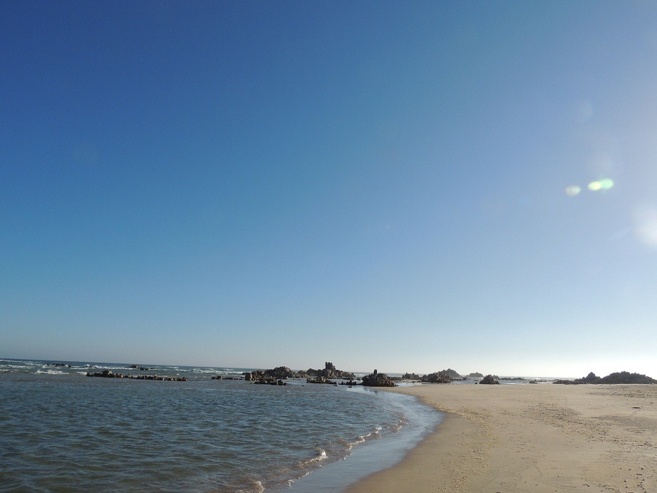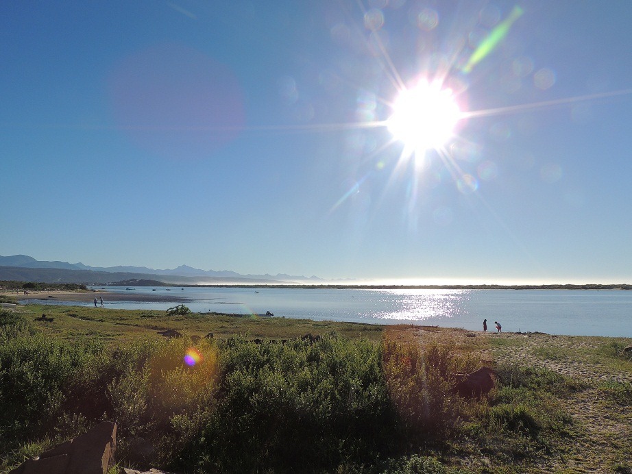 Der Campingplatz, Keurbooms LagoonCaravn Park, liegt direkt an einer Lagune und hat ein paar Campsites, welche sich eben an besagter Lagune befinden mit einem herrlichen Sandstrand davor. Die Lagune ist bei Flut etwa 200m tief und kann eigentlich komplett (wenn man kein Problem damit hat, dass einem das Wasser dann bis zum hals steht) von Nichtschwimmern durchwandert werden, so flach ist hier das Wasser. Und da die Lagune nicht sehr tief ist, sehr geschützt liegt, ist das Wasser hier sehr ruhig ohne Wellen und sehr warm. Aber das Beste ist, der Blick ist Traumhaft – wie man sich in Ibiza heute noch wünschen würde und es ist absolut leer – keine Menschenseele außer eben die paar Camper, die an der Wasserfront stehen und der ein oder andere einheimische Wochenendfischer, der hier ein paar Flossentiere versucht zu angeln.