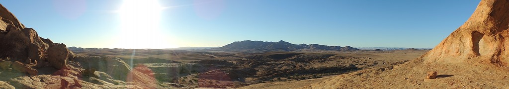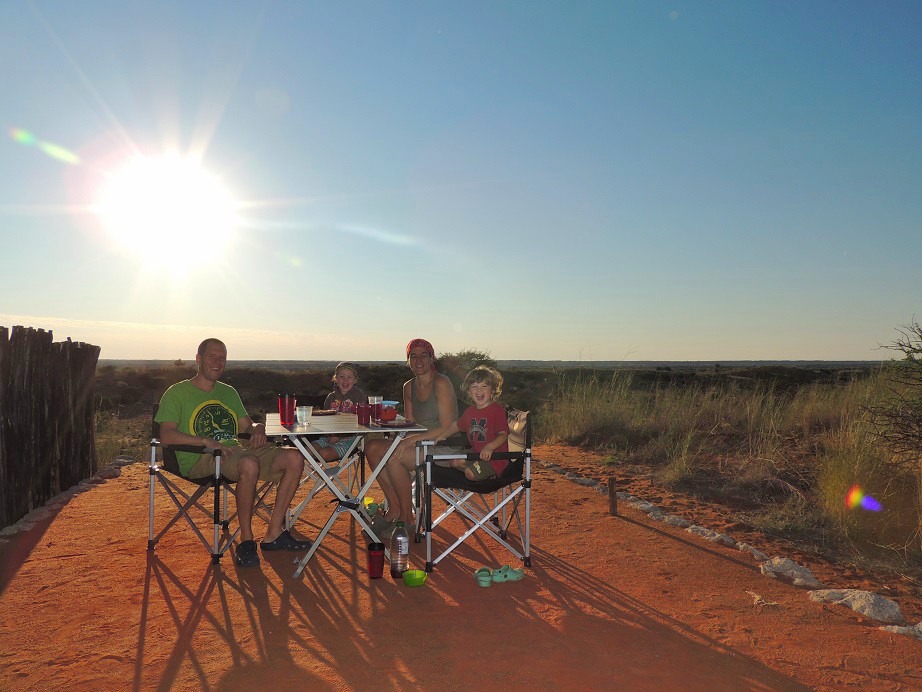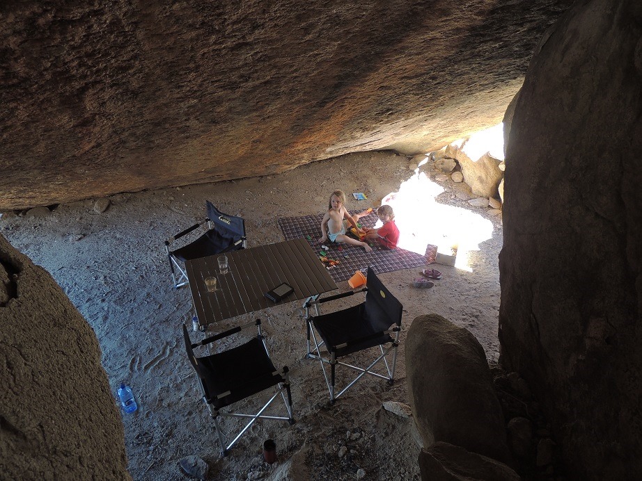 Der Berg, an dem wir dieses mal standen war allerdings nicht ein etwas größerer Fels, sondern wirklich ein Berg. Das interessante hierbei war, dass der ganze Berg ein einziger Fels war, über den wir dann in den Abendstunden noch eine schöne Wanderung gemacht haben, um dabei direkt unseren nächsten Campingplatz zu finden, den wir dann nach 2 Tagen an unserer Höhle aufgesucht haben. Dieser lag ein einem alten Flussbett, zu erreichen nur mit einem 4×4, da die Wege alle Tiefsand waren. Auch hier hatten wir Glück, dass wir wieder eine Höhle hatten, diesmal ca. 10m oberhalb unseres Platzes gelegen, die wir dann genutzt haben um hier unseren Tisch, die Stühle und die Spielsachen aufzubauen.