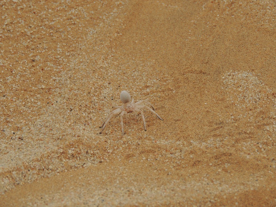 Weiter ging es dann durch die Wüste zu der nächsten Entdeckung. Was unglaublich war – wir sind praktisch gemütlich zwischen vielleicht 10 und 20 km/h gecruised und auf einmal hielt Tommy an, hat irgend ein Zeichen in einer Düne gesehen und fing an zu buddeln. So sind wir dann an die Dancing White Lady gekommen, eine sehr selten zu sehende Spinne, etwa so groß wie eine Kinderhand. Sie hat den Namen daher, da sie sich tanzend bewegt und die Dünen nicht herunterläuft, sondern herunterrollt. Das sieht total klasse aus. Der Biss brennt wohl 3 Stunden Stunde wir Feuer, ist aber nicht weiter gefährlich.