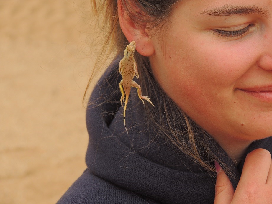 Zwischendurch gab es dann immer noch mal interessante Entdeckungen von ohrfressenden Eidechsen (everything in the desert bites – war eine Aussage von Tommy) oder durchsichtigen Geckos (übrigens wunderschön in Natura).