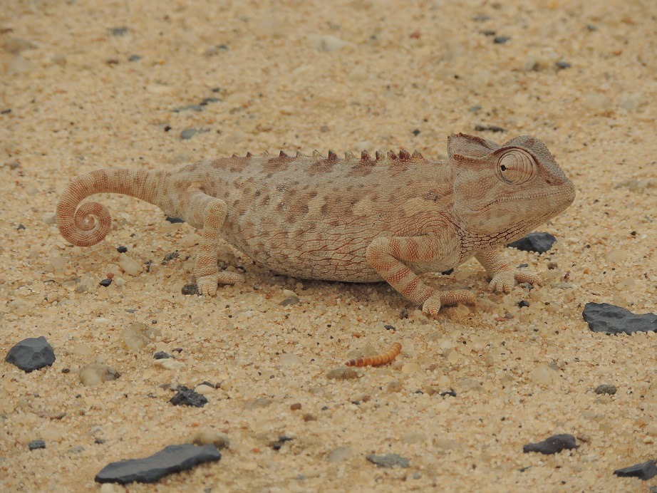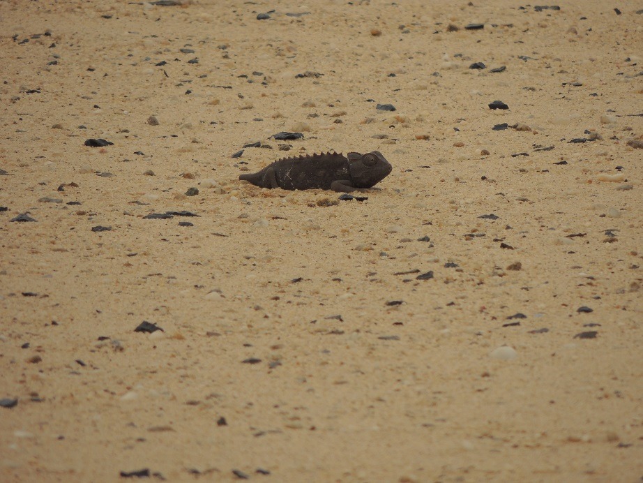 Die nächste Station war dann ein kleines Steinfeld mit schwarzen Steinen an dem wir völlig spontan anhielten. Lenja meinte dann so “ich kann ein Chamäleon sehen – da vorne”. Wir konnten nix sehen außer ein paar schwarze Steine. Unser Fahrer, Johann, fing dann schon an zu grinsen als Lenja das sagte und meinte: “hm, mal schauen”. Wir sind dann alle ausgestiegen und etwa 30m auf einen schwarzen Stein zugelaufen, Unglaublich – was sich da auf einmal bewegte als wir näher kamen…