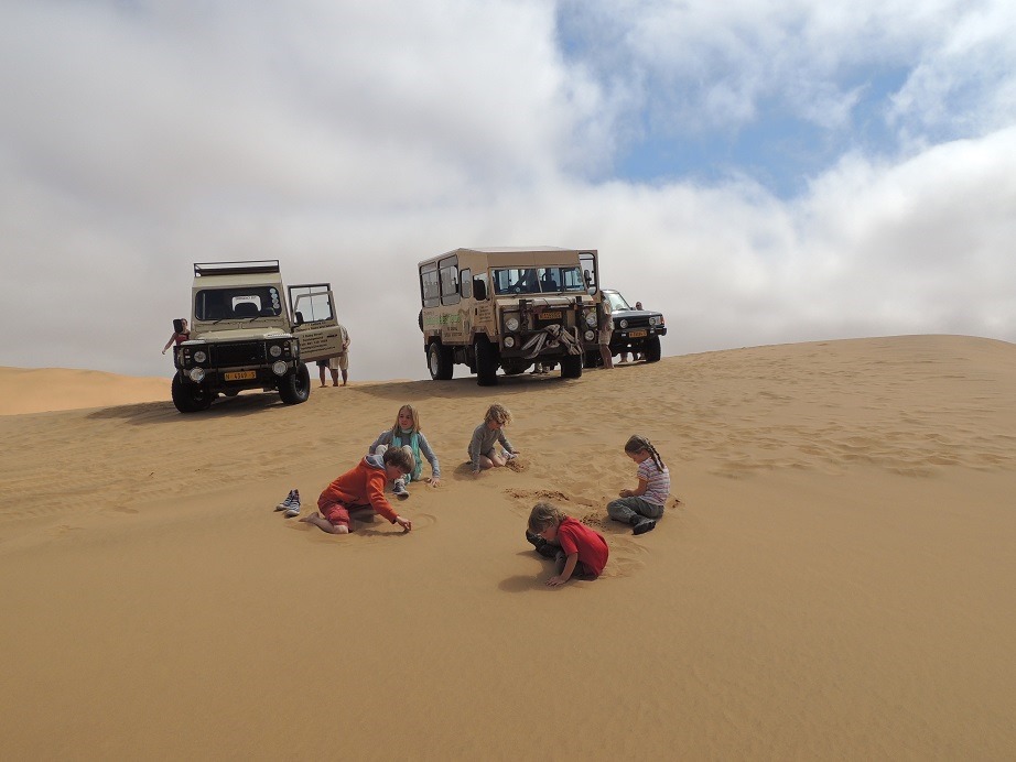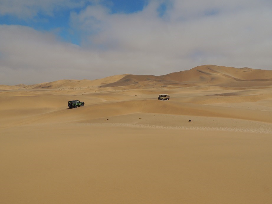 Auch nicht zu kurz gekommen sind die extra Stops um mal ein bisschen im Sand zu spielen mitten in der Wüste oder ein paar Fotos zu machen von der beeindruckenden Schönheit. Hier hat leider die Panorama-Funktion der Kamera kläglich versagt weil die Dünen wohl alle zu gleich aussehen als dass die Elektronik hieraus hätte eine brauchbare Aufnahme machen können, das muss ich wohl selber machen am Computer… Ach ja, das ist ein Foto von 2 Wagen unserer Gruppe bei der Dünen Fahrt, alles natürlich Land Rover, ein alter 101 vom Militär, ein Disco und wir (Moni, die Kinder und ich) sind in einem Defender, ganz standesgemäß, gefahren