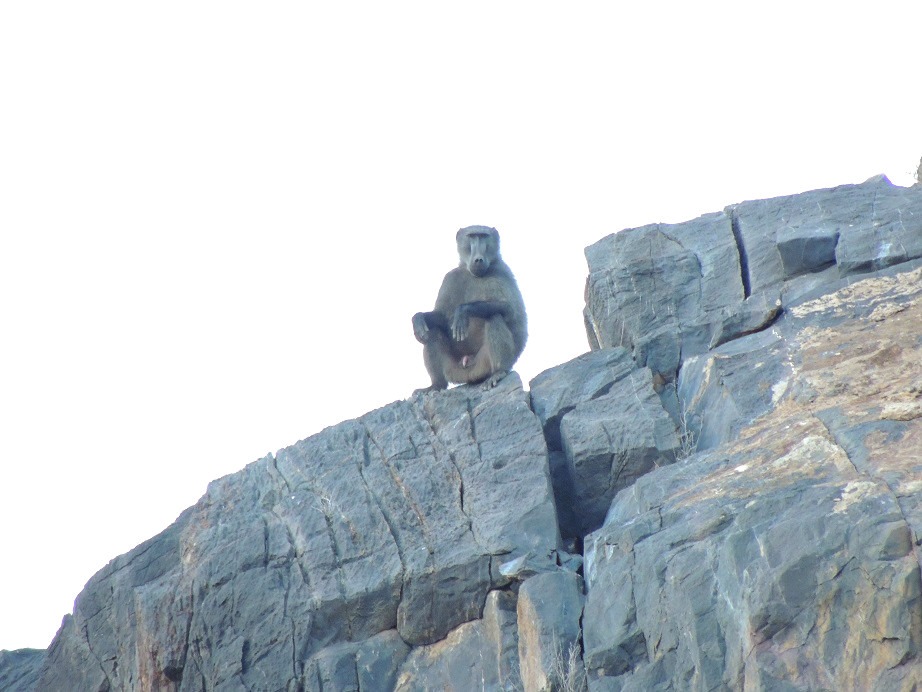 Sonntags haben wir uns dann nachdem wir die Autos final gepackt haben aufgemacht zu unserem ersten gemeinsamen Reiseziel, dem Namib Naukluft Restcamp, ein Platz auf dem Moni und ich auch waren, als wir das 2. Mal in Afrika waren. Und in den 8 Jahren hatte sich dort nicht viel verändert. Noch immer war es absolut still und wunderschön. Abends in der Dämmerung hörten wir es dann auf einmal von den Bergen in die Schlucht, in der der Platz liegt, brüllen… Schnell hatten wir den Verursacher entdeckt, in ca. 300m Entfernung saß auf der Bergspitze ein Pavianmännchen von beachtlicher Statur.