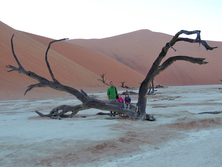 Auf Grund des nächsten Bildes kann man vielleicht erkennen, warum das Ding Dead Flei heißt – es ist eine riesengroße weiße Pfanne mitten in der Wüste in der alle Vegetation ausgestorben ist. Die gesamte Pfanne von ca. 500*500 Metern ist übersäht mit toten Bäumen. Und da wir ja wie gesagt schon sehr früh unterwegs waren, liegt das ganze Tal zwischen den Dünen hier noch im Schatten. Das hat den klaren Vorteil, dass es hier jetzt noch keine 45 Grad heiß ist, sondern wesentlich angenehmer, so dass man sogar noch eine Jacke tragen muss.