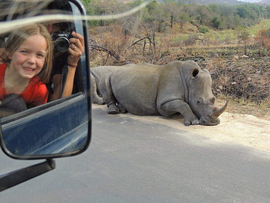 Bis zu diesem Zeitpunkt hatten wir im Krüger noch keine Nashörner gesehen. Aber am vorletzten Tag, angekommen bei Berg-en-Daal, einem Camp ganz im Süden, hatten wir Glück und haben 2 Nashörner am Straßenrand liegen sehen, die es sich in der Sonne auf einem schönen Sandbett gemütlich gemacht hatten.