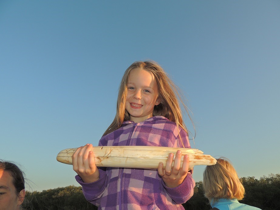 Ach ja, das, was Lenja und Silas hier in ihren Händen halten ist kein Stoßzahn von einem Elefanten, sondern ein Hippo-Zahn, von welchen die Prachtkerlchen ganze 10 Stück im Mund haben – 6 unten und 4 oben! Die Dinger sind von der Dichte her stabiler als Elefantenstoßzähne und werden zu Verteidigung! genutzt. Jetzt können wir auch verstehen, warum Hippos die für Menschen gefährlichsten Tiere im südlichen Afrika sind. Wenn man so ein Ding in die Rippen bekommt, sieht es ganz schön schlecht aus. An dem Zahn kann man ganz gut ausmachen, wie groß so ein Maul von einem Hippo ist und das sie nicht zu unterschätzen sind, die niedlichen, trägen, Dicken. Und wie schnell solche behäbig erscheinende Tiere werden können, hat man ja vorher bei dem Nashorn gesehen. So schnell kann man als Mensch garnicht rennen, wie die einen einholen und Niedermetzeln.