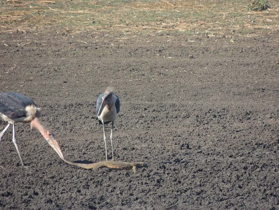 an einem Wasserloch auch noch auf ein paar andere, interessante Tiere gestoßen. Hierzu zählte eine Gruppe von Marabus, die sich ihre Zeit damit verbracht haben, andere Tiere die sich am Wasserloch befanden, zu ärgern. Egal ob es Gnus waren, die sie wieder verscheucht haben, ein Geier auf den sie eingehackt haben, oder dieser Varan, der im wahrsten Sinne des Wortes immer versucht hat, den Schwanz einzuziehen.
