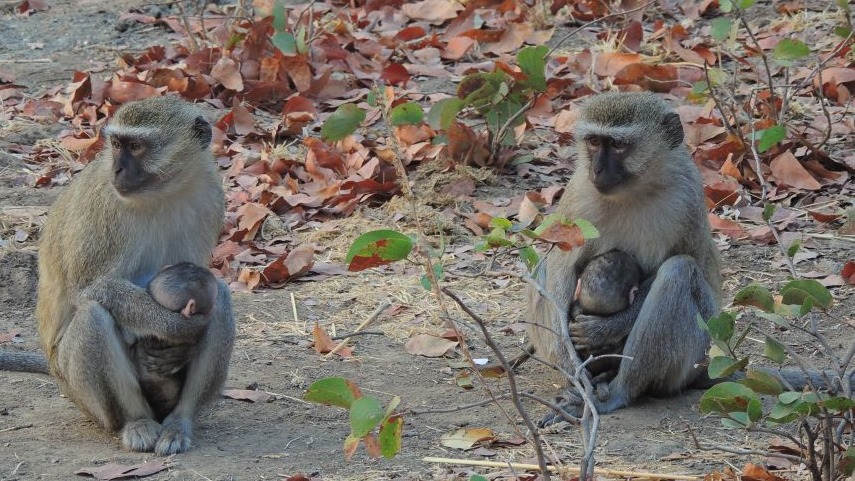 Aber das waren nicht die Besucher die uns irgendwie gestört hätten. Denn zusätzlich zu den großen Besuchern zählten noch die kleineren, die in den Bäumen über uns wohnten. Die sehen zwar total süß aus, gerade wenn sie auch noch die Kleinen mit dabei haben, haben es aber faustdick hinter den Ohren. Gemeint sind die Velvet Monkeys, eine kleine Affenart.