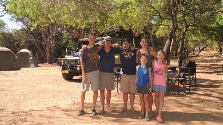 Aber ein Gutes hatte das ganze – es hat zu einer neuen, interessanten Bekanntschaft geführt. Als wir auf der Campsite waren und ich in sehr ärgerlichem Ton mit der Werkstatt telefoniert hatte, kam ein TourGuide auf uns zu und hat seine Hilfe angeboten – er sei, mit seinem Kollegen, auch Automechaniker. Wie sich später herausgestellt hatte waren es 2 Simbabwer die auf ihre Gruppe (10 Deutsche) warteten um durch Sambia zu reisen. Über die 3 Tage die wir an dem Platz verbracht haben, hat sich eine Art Freundschaft entwickelt, die mit einem gemeinsamen Abendessen und einem Abschiedsfoto am Morgen danach endete. Wir haben viel von beiden gelernt, über ihre eigenen Geschichten, Simbabwe als Land, und die Tätigkeit als Tour Guide. Aber das jetzt alles hier wiederzugeben wäre zu viel, das kommt vielleicht mal in eine Buch Zwinkerndes Smiley Was uns dieses Verhalten (gesehen dass jemand ein Problem hat, und direkt Hilfe angeboten) gezeigt hat – die aller meisten Menschen hier im südlichen Afrika wissen noch wie wichtig es ist, dass man sich gegenseitig hilft… Auf diesem Weg ein herzliches Dankeschön für die gemeinsame Zeit und die vielen sehr interessanten Geschichten aus eurem Leben, Michael und Jeremy!