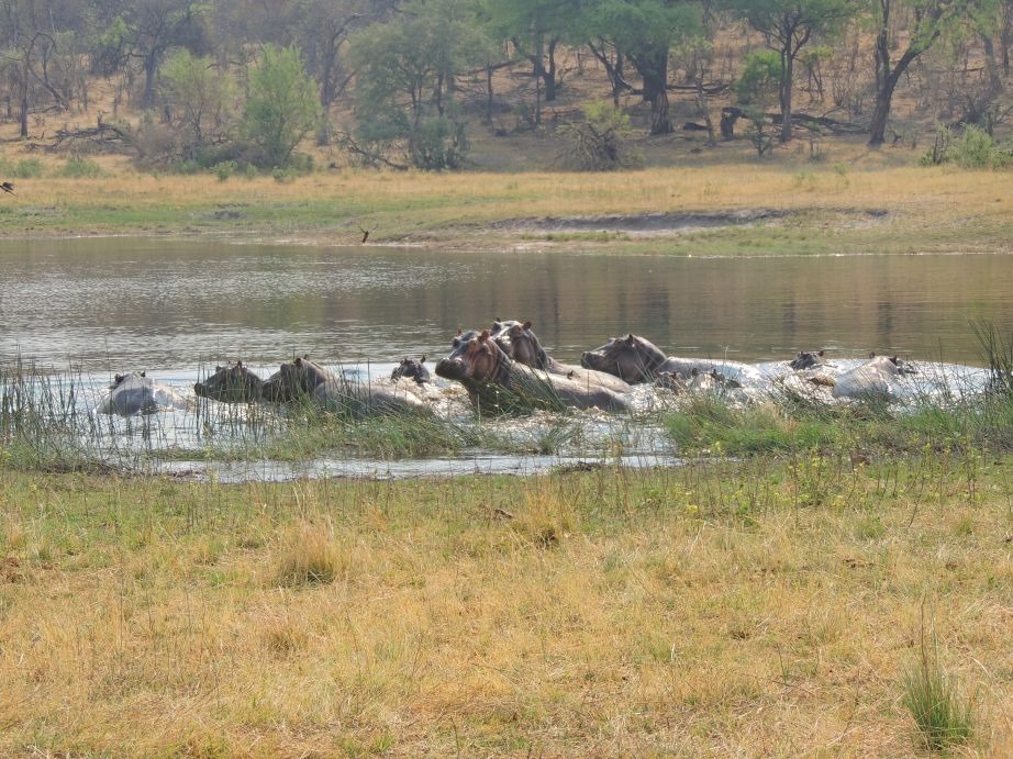 Tja, da hat es wohl einen kleinen Unfall gegeben. Am nächsten Tag konnte man schon deutlich Bisspuren an dem toten Hippo erkennen, das wie ein aufgeblasener Sack im Wasser trieb. Apropos Wasser – wir hatten ja davon gesprochen, dass wir auch das ein oder andere mal einen Fluss (nass oder trocken) gequert haben. Da waren die Tiefsandfahrten im trockenen Flussbett manchmal schwieriger als die auf Sandsäcken gebettete Nassfahrt. Hat aber trotzdem Spaß gemacht.