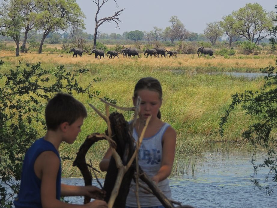 Nach dem puren Luxus und mehr als üppigen Essen sind wir dann in den nächsten Park, auch wieder ein sehr kleiner und schöner Park, der Mudumo. Hier haben wir dann direkt im Park auf einem Stellplatz ohne alles (außer einem Plumpsklo) 3 Nächte verbracht. Das war der Hammer. Die Kinder wollten hier zu erst nicht hin weil es keinen Pool gab (bei 37 Grad kann man den echt brauchen). Aber als sie dann mal eine Stunde da waren haben sie schnell gemerkt, dass man auf so einen Platz auch eine Menge machen kann… Prompt wurden Stöcke gesucht, ein Tipi gebaut, und alles zusammen gekarrt um so zu leben wie die Menschen in der Steinzeit. Wir haben dann durch ihr Steinzeitdorf 2 Führungen bekommen, einen Morning- und einen Evening-Walk. Lenja hat sogar abends im Bett gelegen und für den nächsten Tag ein Programm erstellt, was sie uns alles zeigen möchte. Das haben wir dann glatt mal auf Video festgehalten. Alles was ihr seht, haben sich die Kinder zu 100% selber ausgedacht.