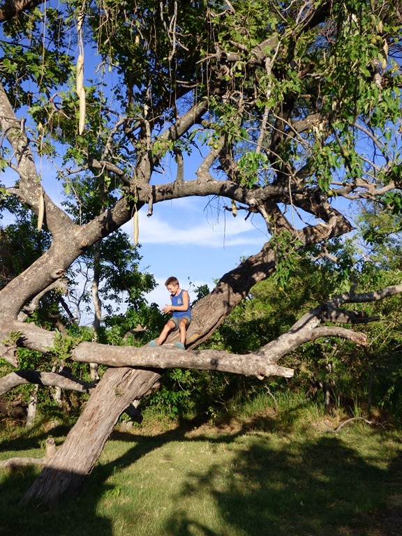 ein typischer Baum ist z.B. der “Leberwurstbaum”, wie er frei übersetzt heißt und ein bevorzugtes Kletterziel von Silas ist, weil man darauf so schön die Würstchen pflücken kann.