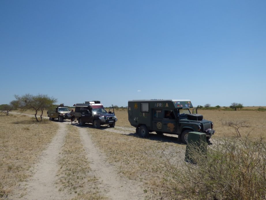 Wie wir dann bei der weiteren Fahrt Richtung Pfannen festgestellt haben, führen alle Wege nach Rom (zu den Pfannen). Es gibt nur gefühlte 231 unterschiedliche Möglichkeiten dort hinzukommen. Aber wenn man sich nicht von den Gabelungen alle 100m verwirren lässt, kommt man letztendlich immer wieder auf dem einen großen Weg aus, der einen zielsicher in die Pfannen führt – auch wenn man zwischendurch mal einen neuen Weg suchen muss, weil irgendwer mal wieder einen Zaun mitten über den Weg gebaut hat. Aber das ist eben Afrika. Wir waren auf jeden Fall eine schöne kleine Reise-Karawane.