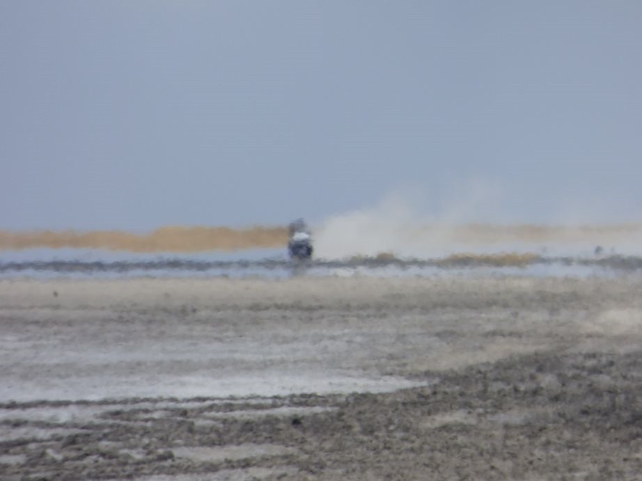 Neben dem ganzen Salz gibt es dort auch noch etwas anders in gigantischen Mengen – und das ist Staub. Je nachdem wo man gerade fährt ist der Boden von einer 5-10cm dicken Staubschicht bedeckt die so fein ist, wie das feinste Mehl was man sich nur vorstellen kann. Und wenn man da dann mit 60-70 km/h durchfährt, zieht das eine schöne Staubfahne nach sich, wie bei Thomas schön zu erkennen ist.
