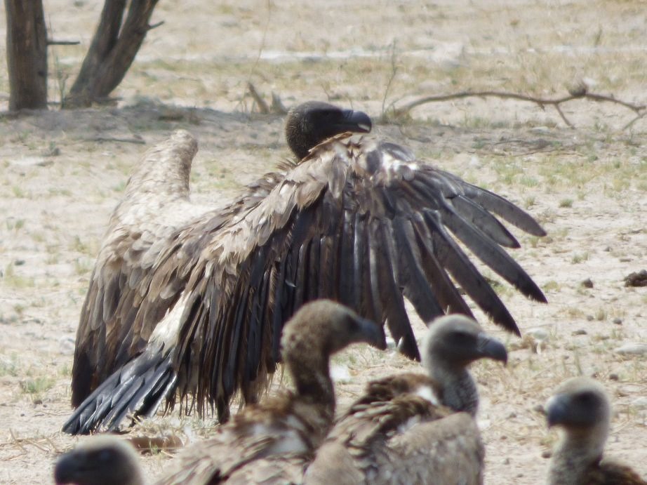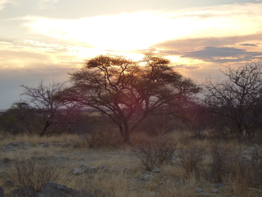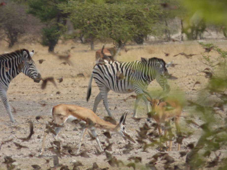 Am Wasserloch (sehr klein) sammeln sich auch tagsüber schon viele Tiere, nicht nur zur Abendstunde. Am coolsten fanden wir dabei die Vogelschwärme von mehreren tausend kleiner afrikanischer Buchfinken. Die sind wie Wellen immer wieder von den Büschen in das Wasser geflogen und dann wieder zurück auf ihre Büsche. Man konnte praktisch kein Foto machen ohne eine Horde von denen mit draufzuhaben. Und die Geräuschkulisse dazu war echt cool – ein wahnsinniges geflatter…