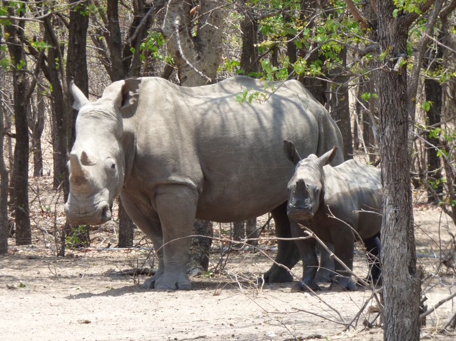 Ok – also Permit beantragt für den nächsten Tag und ab zur Stadt am Morgen. Dort noch mal ein bisschen (1 Stunde) warten (hat natürlich nicht geklappt und es musste noch mal adhoc geregelt werden) und rein in die Stadt. Boahhh – die Stadt selber total aufgeräumt, super sauber, total strukturiert und super schön. Ein bisschen eingekauft zum Futtern im Park und ab in den Park. Und nochmal – wow – super hammer oberklasse Park. Super zu befahren, jede Menge Picknick-Sites, landschaftlich klasse und Tiere ohne Ende – und das für nikkes. Direkt nach der dritten Ecke kommen wir an einem Auswilderungsgehege an (wir haben erst gedacht das wäre eine Picknick-Site) und Moni sieht im Augenwinkel 2 Nashörner (Mutter mit Kind) und meint noch so – “schau mal, die stellen hier sogar lebensechte Tierattrappen aus – sieht total cool aus wie echt – oder sind die echt?”. Die 2 Nashörner haben sich für 30 Sekunden nicht bewegt und wir mussten alle 2 mal hinschauen um zu merken, dass sie wirklich echt waren – wir konnten es nicht glauben.