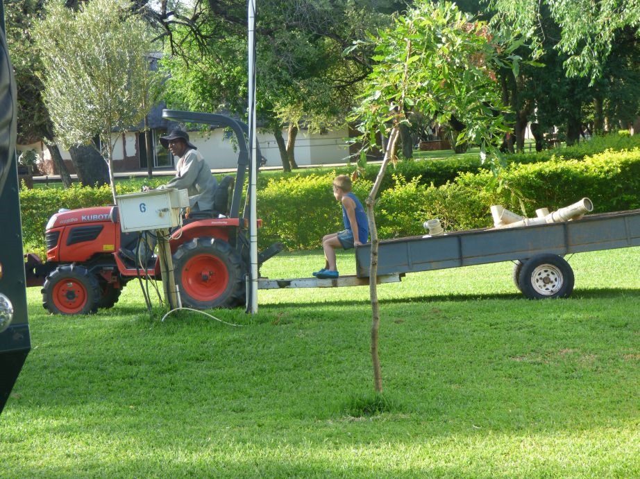 So, nachdem wir nun drinne waren haben wir uns aufgemacht zur nächsten Übernachtungs- und Feiermöglichkeit (für unsere erneute Einreise). Gelandet sind wir nach 2 Stunden Suchen in Lephalale auf einem kleinen Resort, das total leer war. War garnicht so einfach da was zu finden. Wir haben dann nach Camping gefragt und sollten 500 RAND pro Nacht bezahlen. Per Zufall hatte ich dann die Preisliste gesehen und ein Leopard-Cottage entdeckt, das für 600 Rand/Nacht zu haben war. Das haben wir dann glatt genommen und hatten für 100 Rand/Nacht mehr sogar eine feste Unterkunft. Zur Feier des Tages (Einreise für 3 Monate) haben wir uns das dann “gegönnt”. War zwar total alt und halb am auseinerderfallen – hatte aber eine schöne Terrasse, eine kleine Küche und einen Fernseher (den ersten seit 5 Monaten den wir zu Gesicht bekamen ) Abends haben wir dann köstliches Essen für 250 Rand bestellt (ca. 15€) für 4 Personen und die Wiedereinreise zünftig gefeiert. Wir haben dann in Summe noch 2 Tage verlängert und richtig ausgespannt. Da das Resort bis vor kurzem komplett von 400 Indonesiern bevölkert war die in der Nähe eine PowerStation gebaut haben gab es dort auch jede Menge Wohncontainer, die gerade abgebaut wurden. Silas hat es sich natürlich nicht nehmen lassen mitzuhelfen jeden Tag und durfte auch mit dem Traktor fahren und mitfahren Er hatte einen Riesenspaß und die Arbeiter haben Silas nach 2 Tagen schon als “My friend” bezeichnet… Sprache ist eigentlich nie eine Barriere – und freundliches Verhalten und viel Lachen bring einen immer ans Ziel…