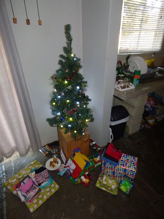 Nachdem wir also nun Little vollgepackt hatten mit den Weihnachtseinkäufen und unserem Weihnachtsbaum, eine Nacht in einem schönen B&B in Betlehem übernachtet, sind wir dann in unsere Weihnachts- und Neujahresunterkunft aufgebrochen – vom 22.12. bis zum 03.01. können wir uns noch mal in 4 festen Wänden, mit einen kleinen Holzofen, einer Badewanne und einer Dusche, 2 Schlafzimmern und einem Wohn- Koch- & Essbereich erholen. Und das machen wir auch gaaaaaanz dolle. Nach der Ankunft haben wir erstmal den Baum aufgebaut und dann am 24.12. abends nach einem Spaziergang über die Wiesen der Farm die Geschenke darunter “versteckt” Die Kinder hatten dem Christkind einen schönen Leckerteller mit Apfel, Rusk und anderen Leckereien hingestellt, und das Christkind hat auch tatsächlich vieles aufgefuttert… Eigentlich hatten wir geplant hier in die Kirche zu gehen, aber es gab leider keine Weihnachtsmesse so wie man das von uns kennt. Es gab nur eine morgens um 8 Uhr und das war uns dann aber zu viel Stress, da wir auch noch gut 40 Minuten Anfahrt gehabt hätten. Denn im südlichen Afrika wird Weihnachten wie in den USA gefeiert – am ersten Weihnachtstag. Und da wir aber Heilig Abend feiern wollten, haben wir eben einen Weihnachtsspaziergang gemacht.