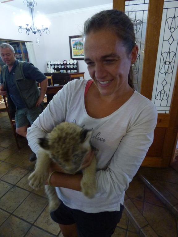 Unten füttern Lenja und Silas den kleinen Löwen (den Moni wegen des Gewichtes schon mit festhalten muss), der gerade 4 Wochen alt ist. Die sind vielleicht puschelig. Und die Geräusche die sie machen. Obwohl wir schon einige jüngere Löwen gesehen haben in der Wildnis, haben wir dieses “Rufen” noch nie gehört. Wir stehen hier übrigens im Wohnzimmer der Familie, die die Löwen zusammen mit 2 süßen jungen Hunden aufzieht. Damit haben sie direkt ein paar Spielkameraden