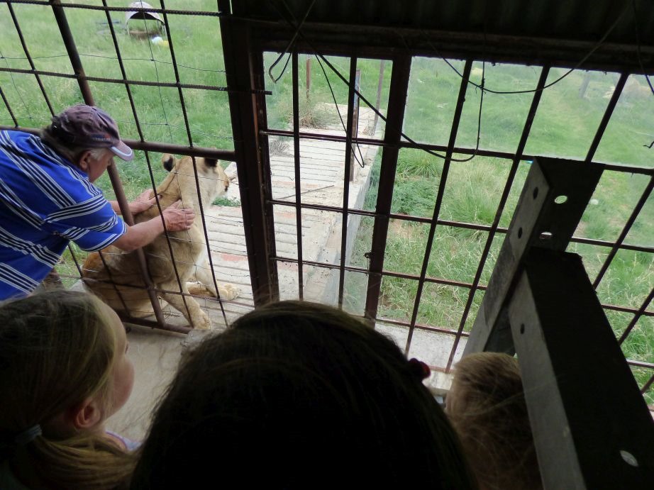 Ha, wir waren gerade bei den Löwen. Ein Erlebnis der besonderen Art. Ein Freund von Anton (Besitzer der Farm auf der wir unseren Urlaub verbringen) züchtet zum Hobby Löwen und hat gerade 2 Mal Nachwuchs bekommen. Die Jungen sind 2 und 4 Wochen alt. Die beiden 4-Wöchigen werden gerade im Haus mit der Falsche aufgezogen, bis sie ca. 3 Monate alt sind, dann kommen sie wieder zu Mutti ins Gehege. Wir hatten das Glück genau zum richtigen Zeitpunkt hier zu sein, so dass uns Anton auf einen Besuch mitgenommen hat und wir die Babys füttern durften und mit ihnen spielen konnten. Sie machen das nicht zu kommerziellen Zwecken für Touristen, sondern eben nur für sich selber zur Freude. Ihr eigentliches “Business” ist der Kohletransport von SA nach Lesotho und nur weil wir uns mittlerweile mit Anton so angefreundet haben, hat er uns mitgenommen. DAS WAR COOL!!! Aber seht selbst…