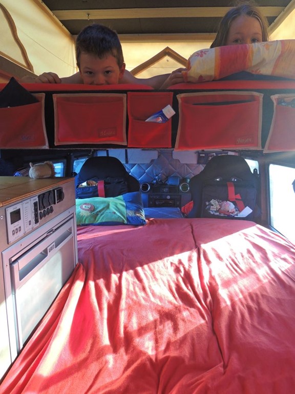 In Schlafkonfiguration ziehen wir einfach das Bett über der hinteren Sitzreihe aus. Somit haben Moni und ich ein großes 1,70mx2m Bett mit richtigen Matratzen, auf dem wir wunderbar schlafen, während die Kinder unter uns nächtigen.