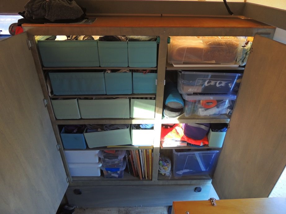 Alles das, was normalerweise so das ganze Haus oder die ganze Wohnung füllt befindet sich in diesem Schrank. Jeder von uns hat eine Reihe auf der linken Seite, in welcher die ganzen Klamotten verstaut sind. darunter gibt es noch ein Fach für die Kinder, mit Spielsachen und Schulmaterialien. Auf der rechten Seite kann man glaube ich gut erkennen, dass wir hier unser Brot aufbewahren, darunter 2 “Kramkisten” mit den ganzen Dingen, die nicht in regelmäßiger Nutzung sind, dann kommen die Kulturtaschen und ganz unten die Schmutzwäschekiste. In der Klappe unter dem Schrank bringen wir 4 Stühle und einen Campingtisch unter – jupp – passt alles rein. Und ganz ehrlich – bisher vermissen wir an materiellen Dingen garnichts. Alles, was wir brauchen zum Leben passt locker in Little. Wir haben sogar noch die ein oder andere freie Ecke, die wir immer mal temporär füllen, wenn wir Großeinkauf gemacht haben und noch nicht alles einsortiert ist. Bisher können wir uns auf jeden Fall nicht über Platzmangel beklagen.